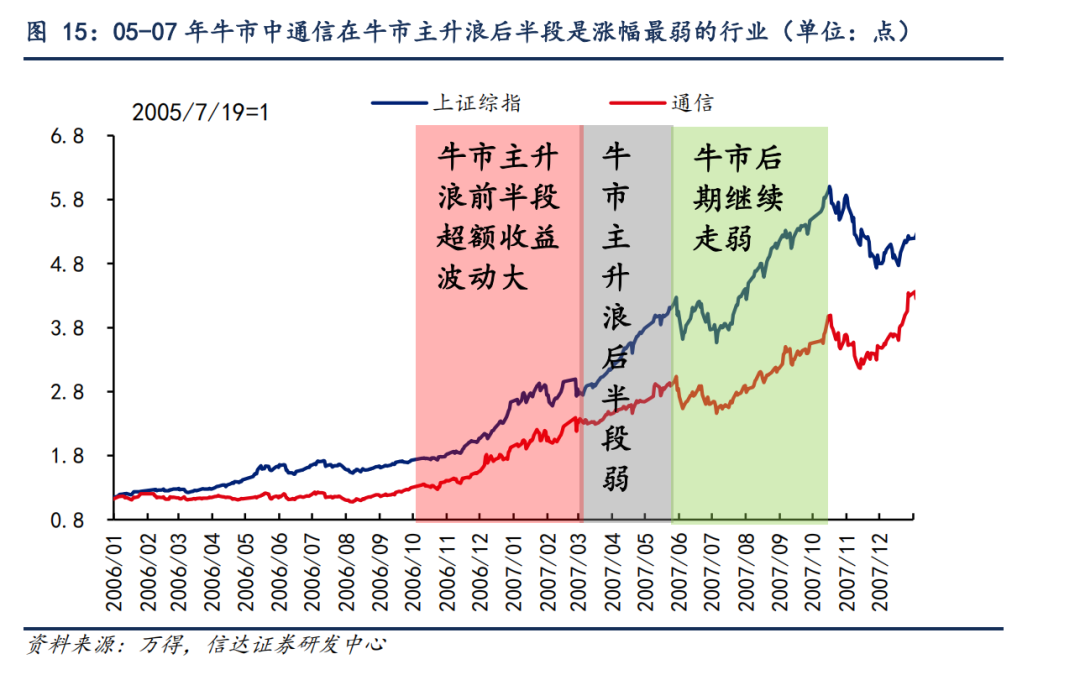 2005-2007年是金融周期牛市,通信在本輪牛市中整體表現(xiàn)較弱。牛市主升浪前半段有一定超額收益,但波動較大,牛市主升浪后半段是漲幅最弱的行業(yè)。2007年3月-2007年5月牛市主升浪后半段,上證指數(shù)季度內(nèi)再次加速上漲,漲幅達到53%。這一階段通信板塊漲幅28%,區(qū)間跑輸上證指數(shù)25個百分點,在一級行業(yè)中排名最后。