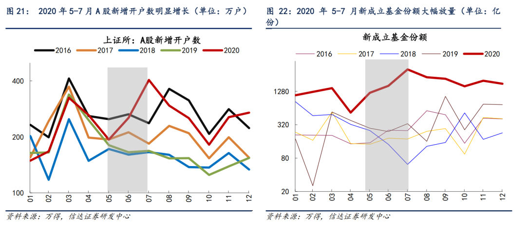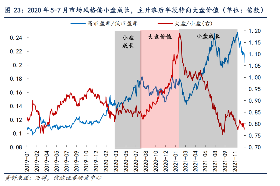 我們認為2020年5月-7月指數(shù)加速上漲而銀行漲幅最弱的原因在于微觀流動性充裕背景下,市場風格偏向小盤成長。這一階段股市中微觀流動性較為充裕,A股新增開戶數(shù)2020年5月-7月有較明顯的上升,同時考慮到本輪居民資金主要通過公募基金產(chǎn)品流入,2020年5-7月新成立基金份額提升幅度較大。市場風格從2020年Q1指數(shù)震蕩期大盤占優(yōu)切換到略偏小盤,成長風格走強。
