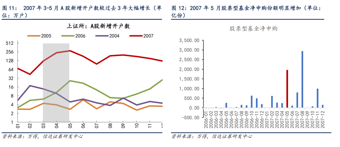 我們認為2007年3月-5月指數(shù)加速上漲而銀行成為表現(xiàn)最弱的板塊之一原因在于,微觀流動性充裕背景下,市場風格切換到成長,低價股策略表現(xiàn)強。宏觀經(jīng)濟強勁背景下,貨幣政策緊縮預期提升,但微觀流動性仍然較好。2007年3-5月上證所A股新增開戶數(shù)分別達到126萬戶、239萬戶和279萬戶,較過去3年大幅增長。2007年5月股票型基金申購份額也有顯著增長。市場風格從2007年Q1的價值風格占優(yōu)切換到成長風格占優(yōu),低價股策略表現(xiàn)較好。