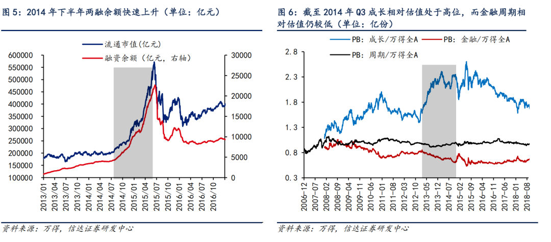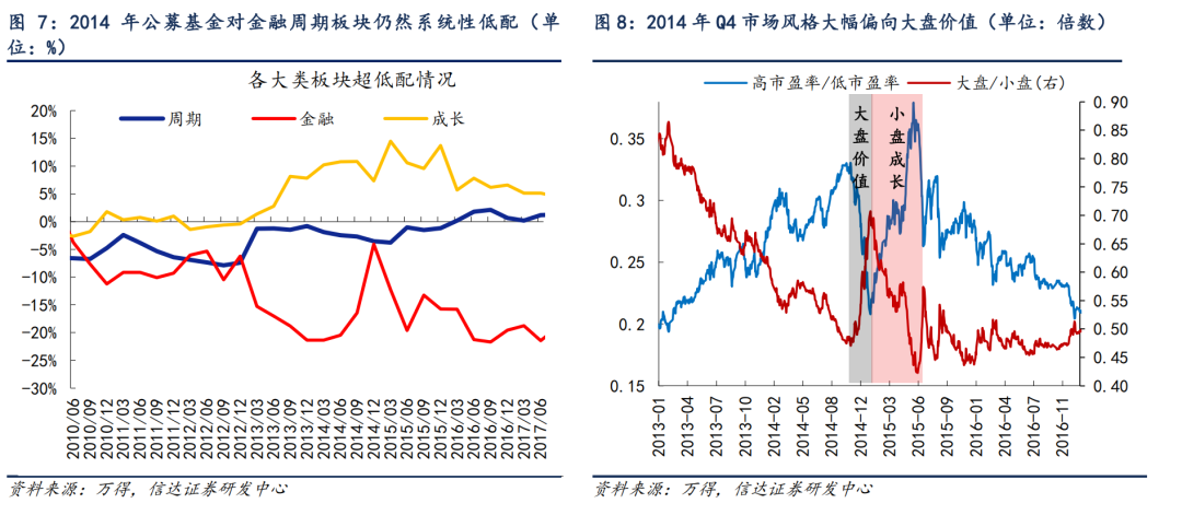 我們認為2014年Q4指數(shù)加速上漲而電子行業(yè)反而下跌的原因在于居民資金流入速度加快的背景下,四季度市場風格高低切換的影響。2014年下半年開始居民資金通過更多渠道流入股市,兩融余額快速上升,市場對業(yè)績的關(guān)注度下降,開始尋找更多處于低位,邏輯上有邊際變化的板塊。2013年-2014年Q3,TMT已經(jīng)持續(xù)領(lǐng)漲1年半左右的時間,而金融、周期板塊的相對估值仍然處于歷史低位。同時,經(jīng)濟和政策的邊際變化也比較積極。2014年11月出現(xiàn)了2012年以來第一次降息,展望下一年經(jīng)濟可能企穩(wěn)不可證偽。存量機構(gòu)對金融周期仍處在系統(tǒng)性低配的狀態(tài)。我們認為以上因素驅(qū)動2014年Q4市場風格向大盤價值切換,而且切換的幅度比較大。