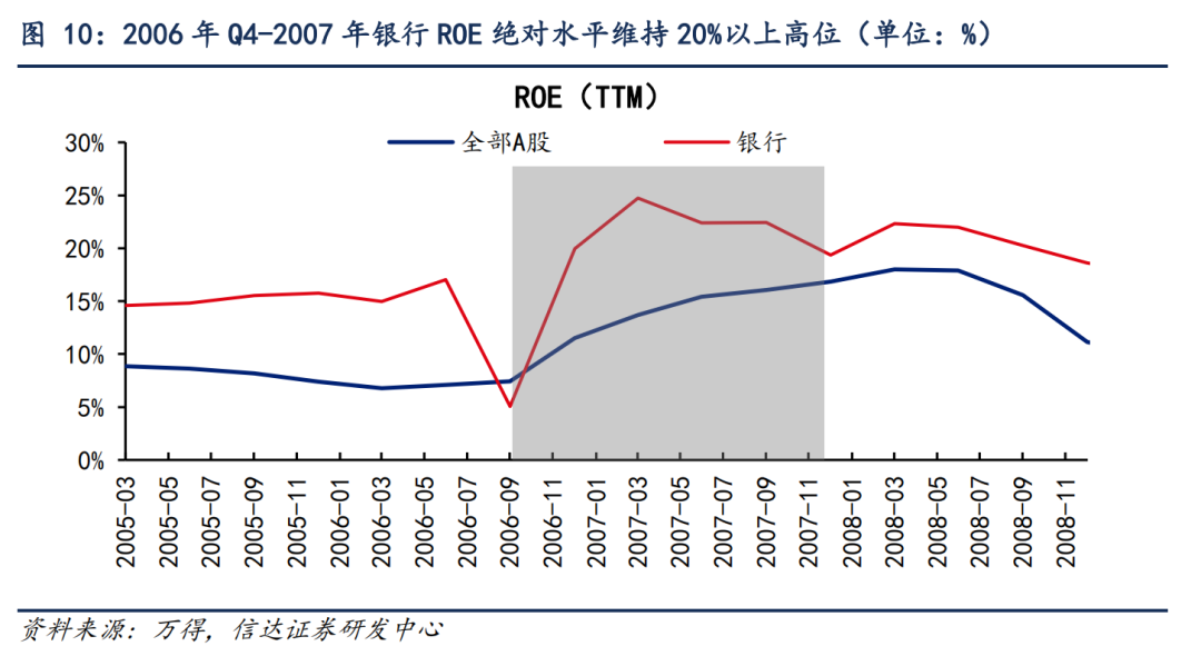 從基本面來看,2005-2007年牛市中銀行板塊業(yè)績兌現(xiàn)較強。2006年Q4之后,受工商銀行上市以及經(jīng)濟高速增長、信貸需求旺盛、息差上升等因素影響,銀行板塊ROE大幅增長至20%以上,2007年銀行板塊ROE絕對水平始終在20%以上高位震蕩。