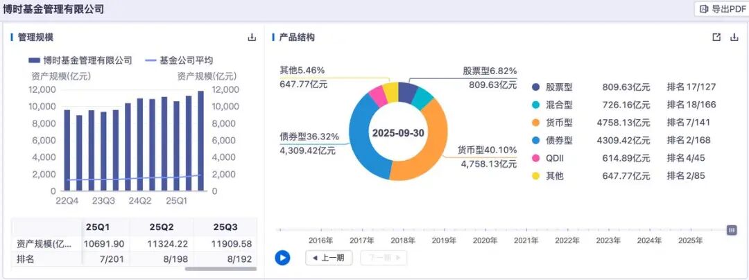 博時(shí)基金管理規(guī)模達(dá)1.19萬(wàn)億元,公募市場(chǎng)排名第8,產(chǎn)品端以固收類為主,債券型和貨幣型基金規(guī)模占比超過(guò)76%。